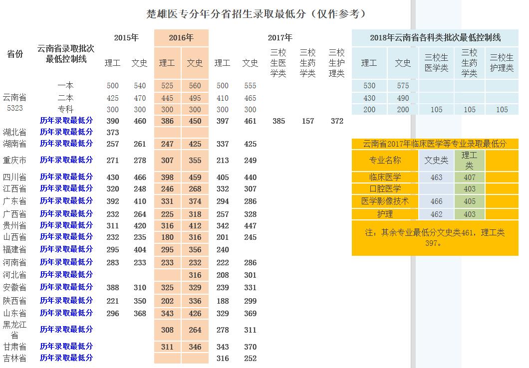 2018年楚雄醫(yī)藥高等??茖W(xué)校分年分省招生錄取最低分