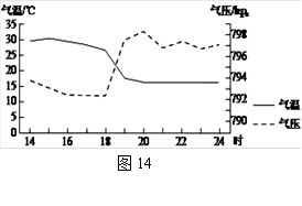 2013年7月30日,我國(guó)西北某地出現(xiàn)強(qiáng)沙塵暴。圖14為該地當(dāng)日14時(shí)~24時(shí)氣溫、氣壓隨時(shí)間變化的示意圖。讀圖回答第27~28小題。