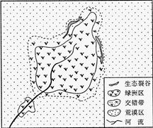綠洲與荒漠的交錯(cuò)帶生態(tài)環(huán)境脆弱,在其附近的綠洲區(qū)過(guò)量開采地下水會(huì)使交錯(cuò)帶生態(tài)環(huán)境退化,形成“生態(tài)裂谷”。圖15為“生態(tài)裂谷”分布示意圖。讀圖回答第29~30小題。