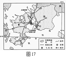 位于瑞典和丹麥兩國(guó)交界處的厄加勒斯海峽地區(qū)擁有多所著名大學(xué),當(dāng)?shù)卣ㄟ^(guò)多種方式支持產(chǎn)學(xué)研合作項(xiàng)目,促進(jìn)了生命科學(xué)、生物技術(shù)、醫(yī)療技術(shù)和醫(yī)藥技術(shù)等產(chǎn)業(yè)的集聚發(fā)展。目前,該地區(qū)已成為歐洲著名的“醫(yī)藥谷”。2000年,厄加勒斯海峽跨海大橋建成通車。圖17為厄加勒斯海峽地區(qū)及周邊區(qū)域圖。