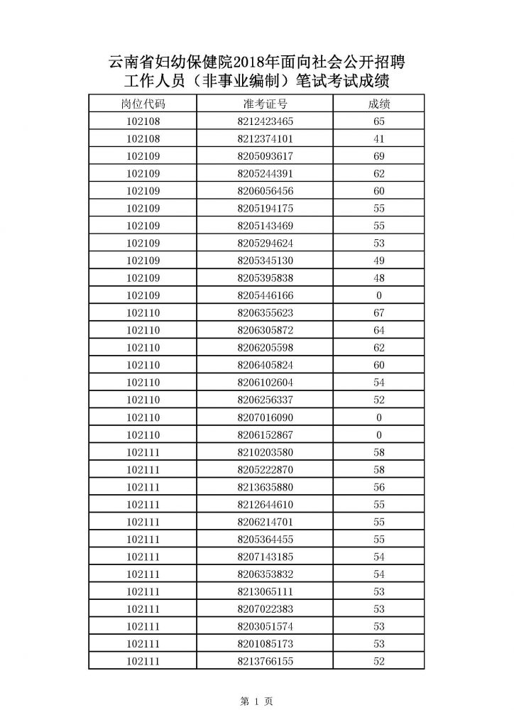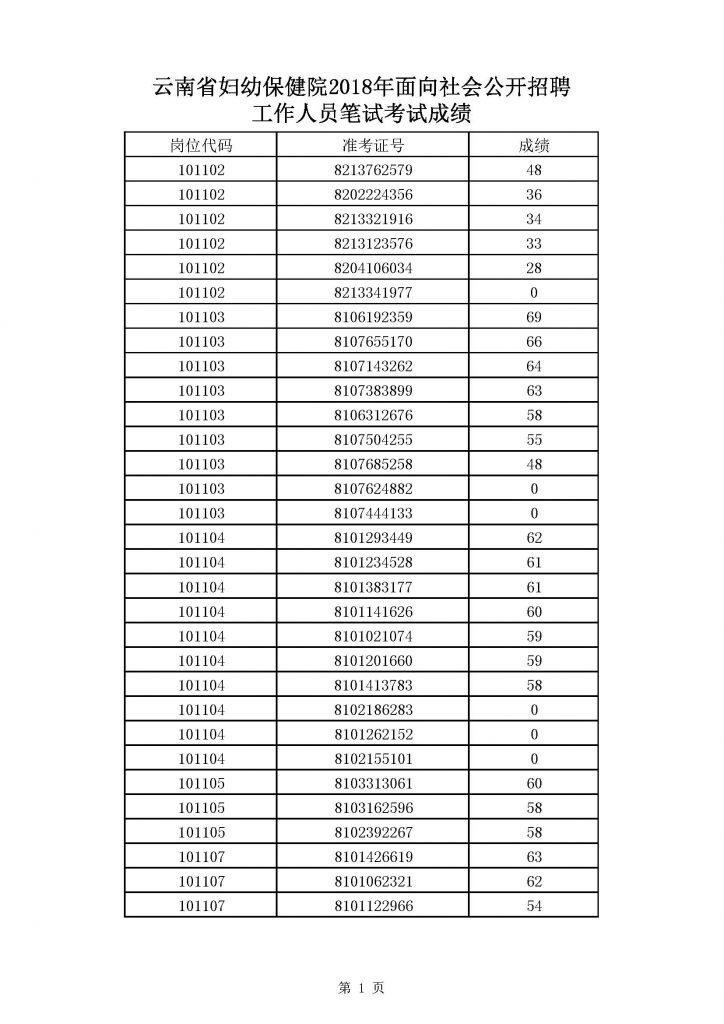 1.云南省婦幼保健院2018年面向社會公開招聘工作人員筆試考試成績