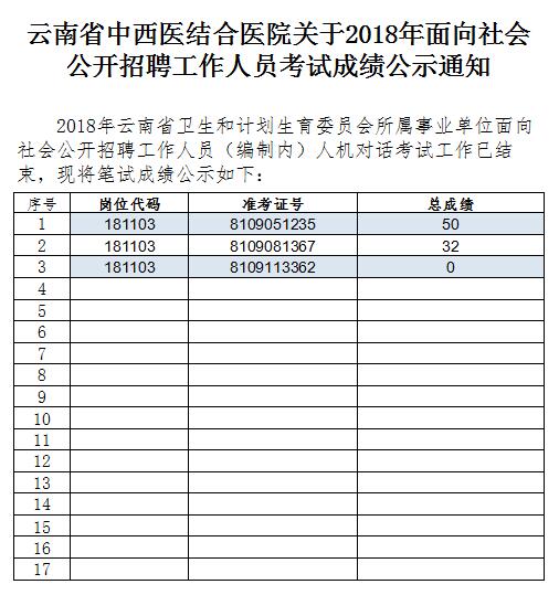云南省中西醫(yī)結(jié)合醫(yī)院2018年招聘工作人員考試成績(jī)公示通知