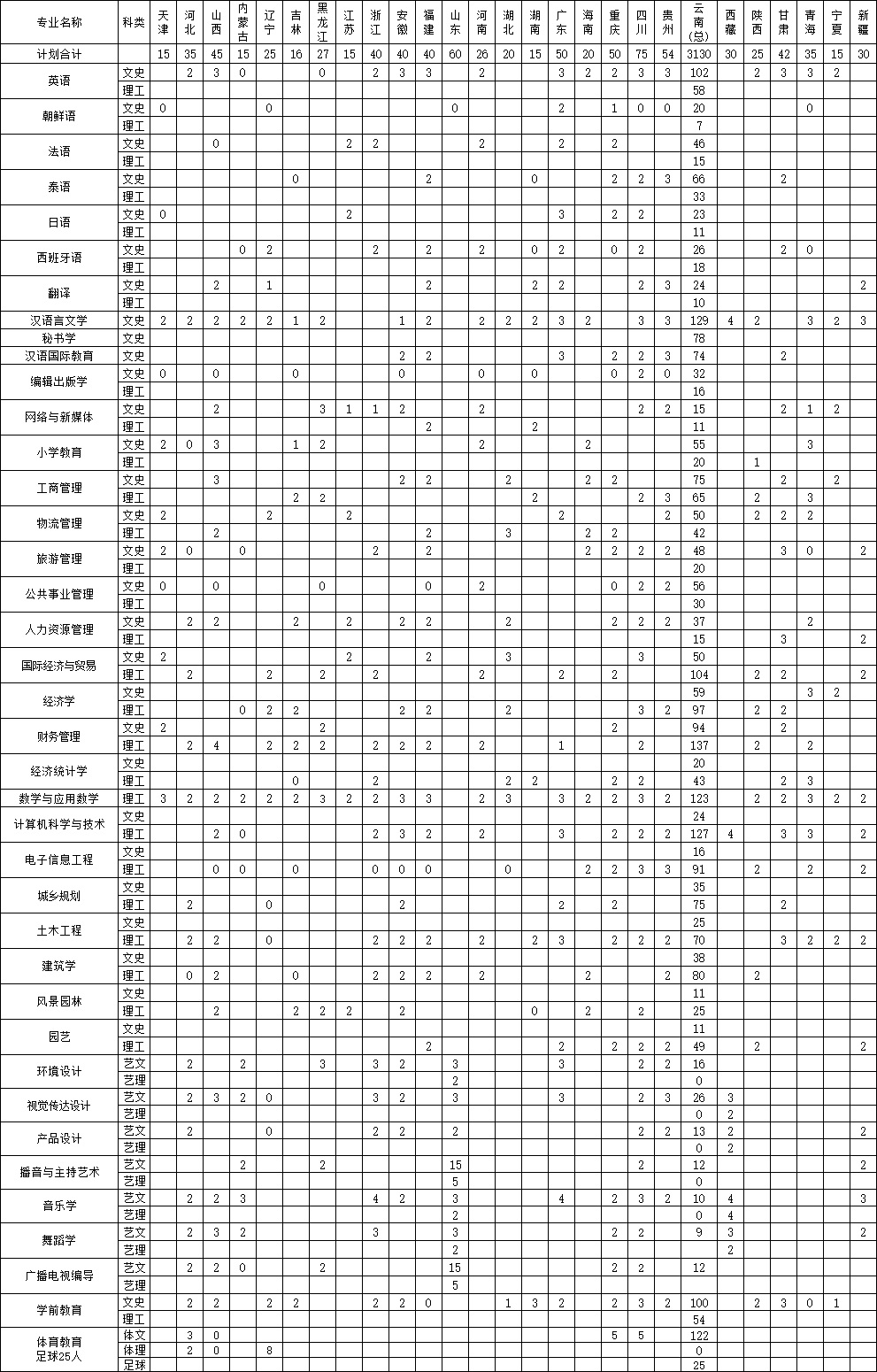 云南師范大學(xué)文理學(xué)院2018年分省分專業(yè)方向招生計劃一覽表