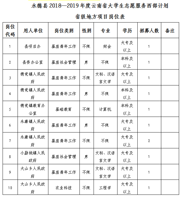 永德縣2018-2019年度云南省大學(xué)生志愿服務(wù)西部計(jì)劃省級(jí)地方項(xiàng)目志愿者新招募名額為19名。