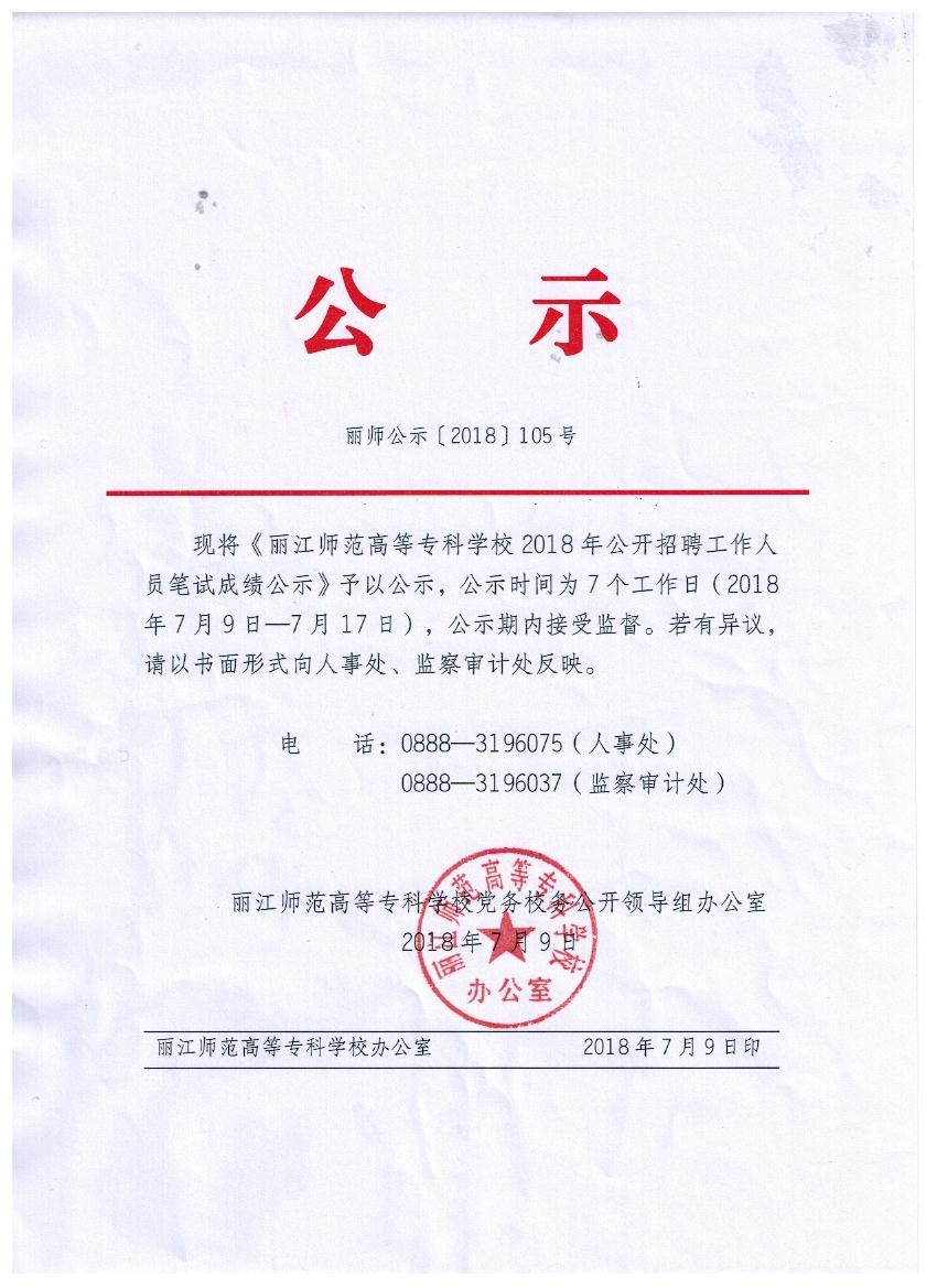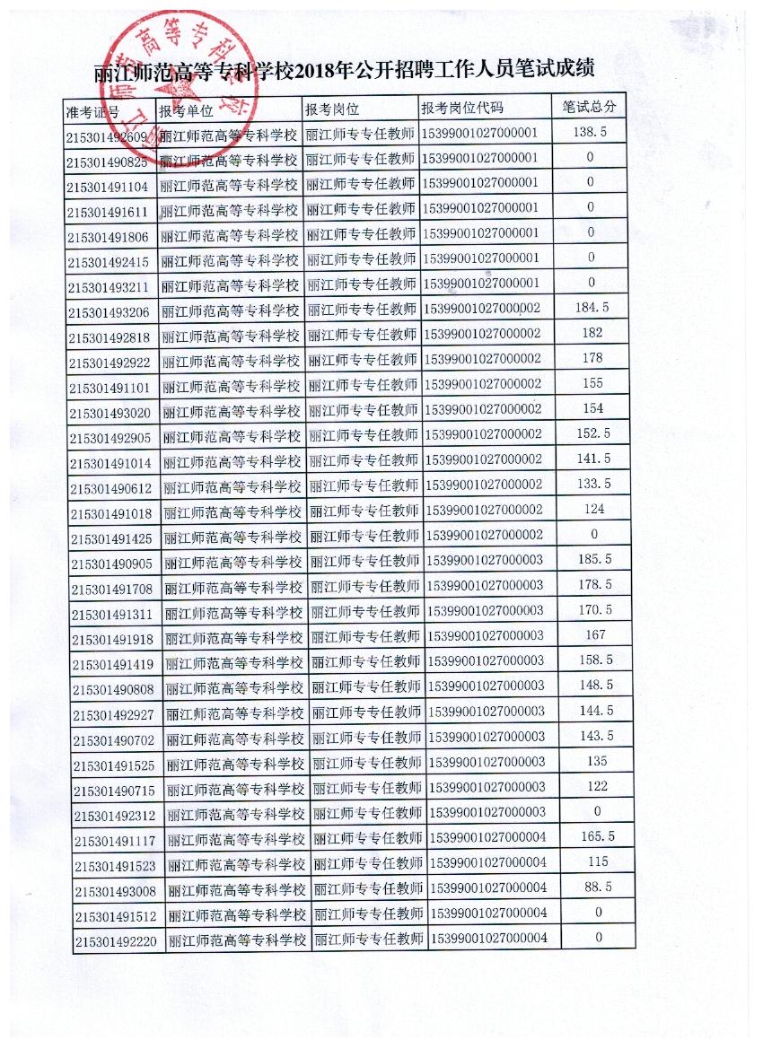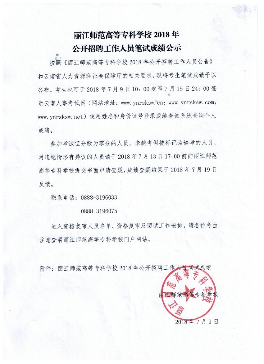 麗江師范高等??茖W(xué)校2018年公開招聘工作人員筆試成績公示