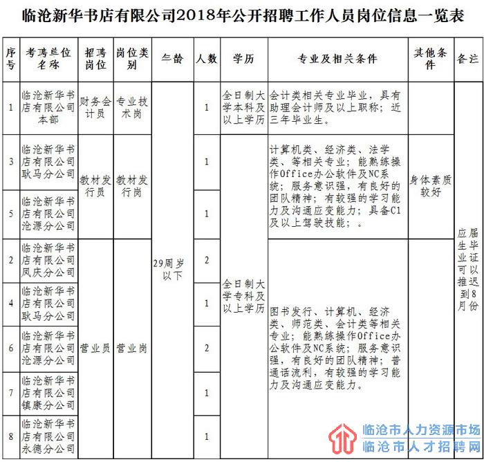 1.臨滄新華書店有限公司2018年公開招聘工作人員崗位信息一覽表