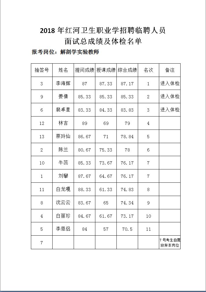 附:2018年紅河衛(wèi)生職業(yè)學(xué)院招聘臨聘人員面試總成績及體檢名單