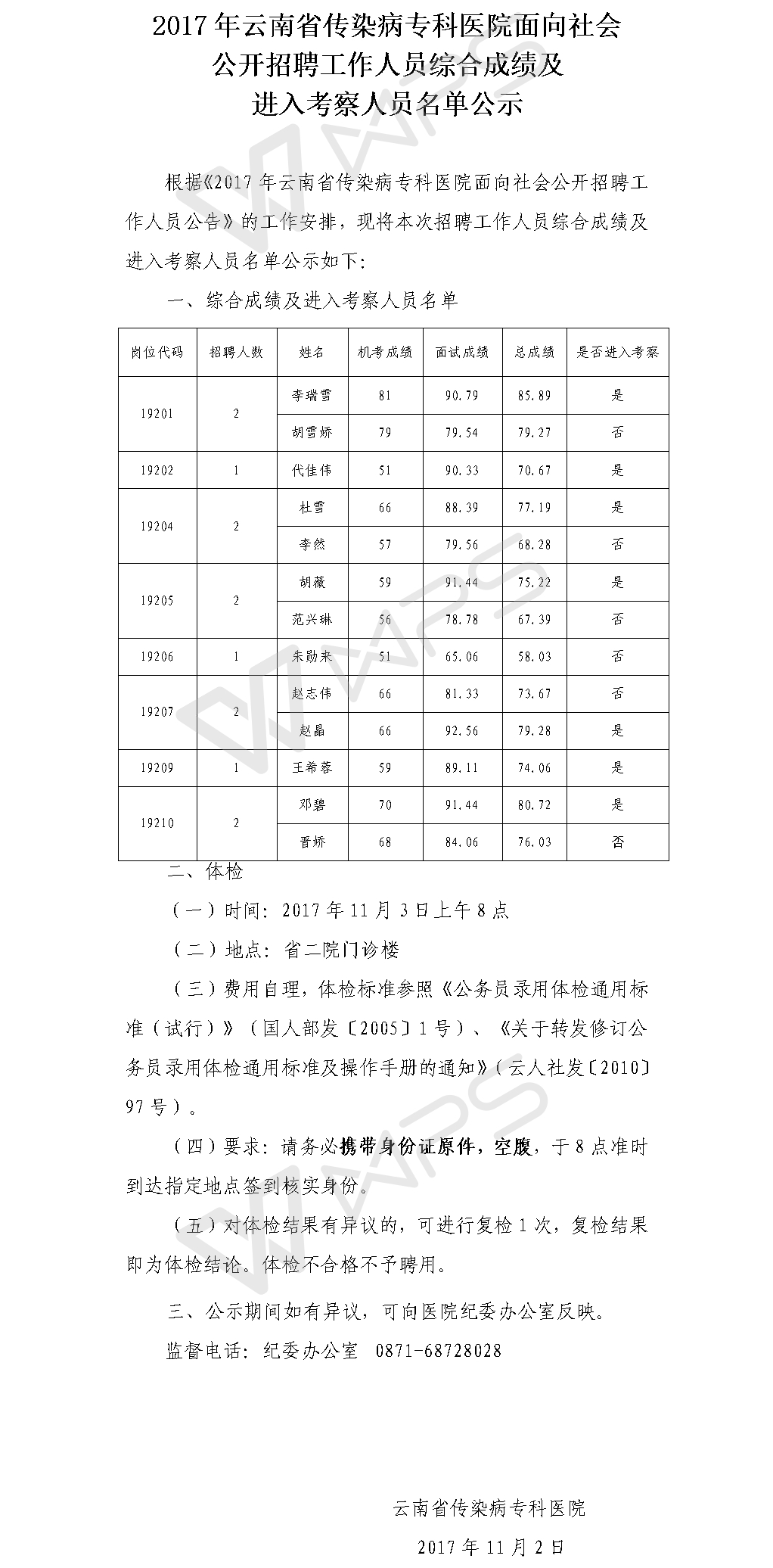 2018年云南省傳染病??漆t(yī)院招聘綜合成績(jī)及考察名單公示