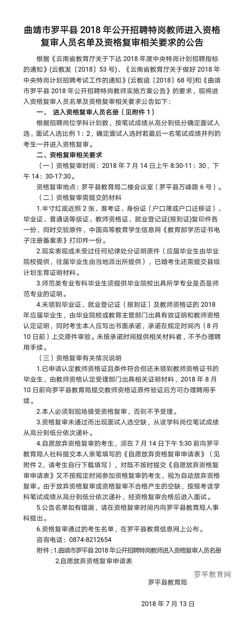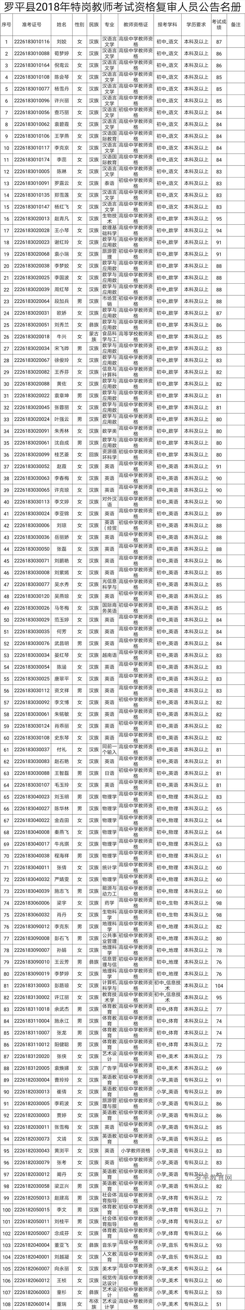 2018年曲靖市羅平縣招聘特崗教師進(jìn)入資格復(fù)審人員名單公告