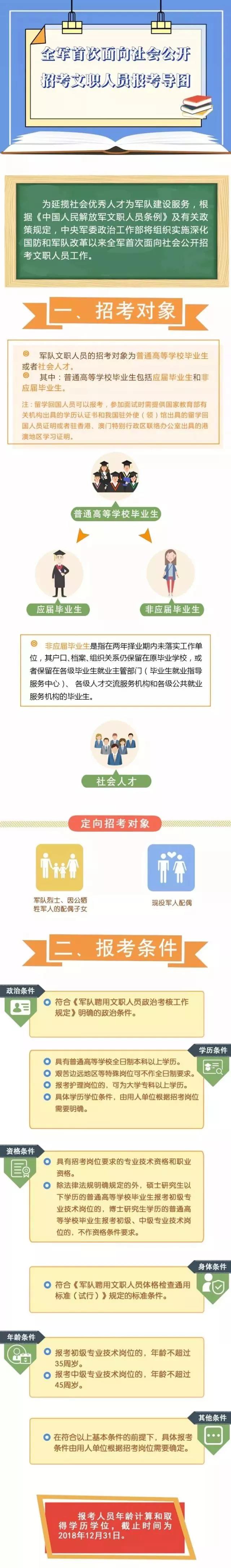 為深化軍隊編制體制調(diào)整改革需要,2018年武警云南總隊面向社會公開招聘優(yōu)秀人才,主要是從事通信和計算機網(wǎng)絡(luò)管理、氣象水文保障、網(wǎng)絡(luò)工程和數(shù)據(jù)庫建設(shè)與維護、經(jīng)濟相關(guān)業(yè)務(wù)管理與研究、采購業(yè)務(wù)審核、會計相關(guān)、心理科醫(yī)療、醫(yī)療衛(wèi)生等相關(guān)工作。所稱文職人員,是指《中國人民解放軍文職人員條例》(簡稱《條例》)規(guī)定的,在軍民通用、非直接參與作戰(zhàn)且社會化保障不宜承擔(dān)的軍隊編制崗位從事管理工作和專業(yè)技術(shù)工作的非現(xiàn)役人員,是軍隊人員的組成部分。文職人員在軍隊和社會生活中,依法享有國家工作人員的相應(yīng)權(quán)利,履行相應(yīng)的義務(wù)。此次招聘文職人員需要滿足以下條件: