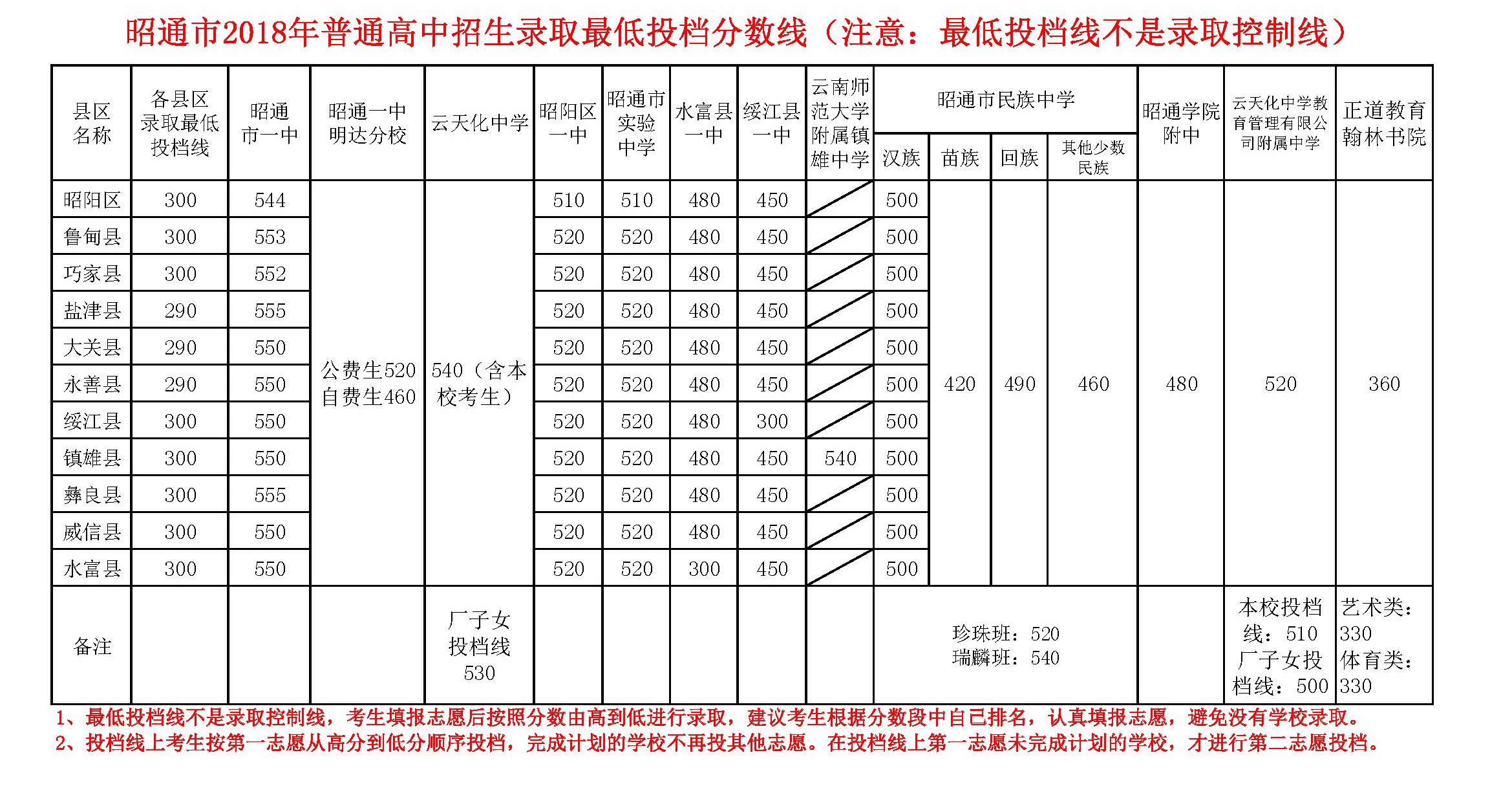 昭通市2018年普通高中招生錄取最低投檔分?jǐn)?shù)線