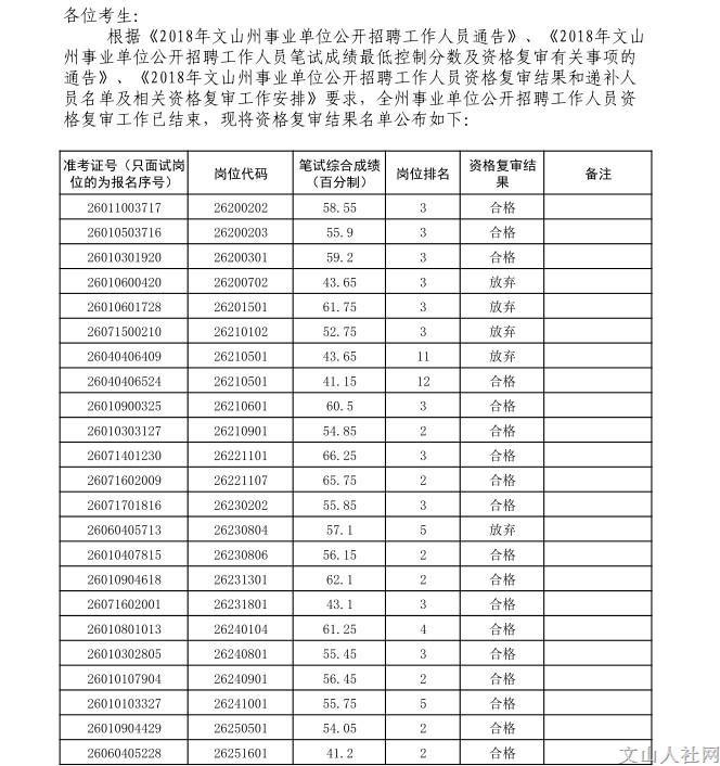 2018年文山州事業(yè)單位公開招聘工作人員資格復審結果