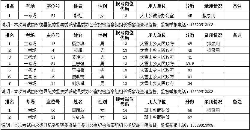 臨滄市永德縣2018-2019年大學生西部志愿者招募筆試成績