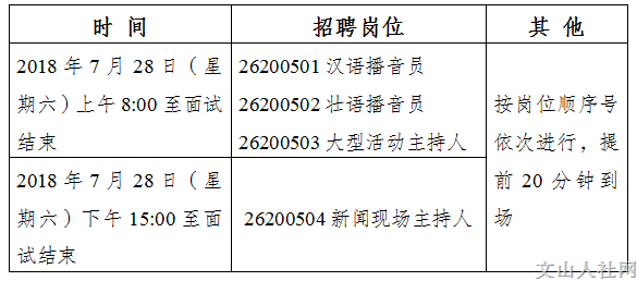 其他有關(guān)要求:漢語(yǔ)播音員、大型活動(dòng)主持人、新聞現(xiàn)場(chǎng)主持人面試時(shí)著正裝、化淡妝。壯語(yǔ)播音員面試時(shí)著本民族服裝、化淡妝。