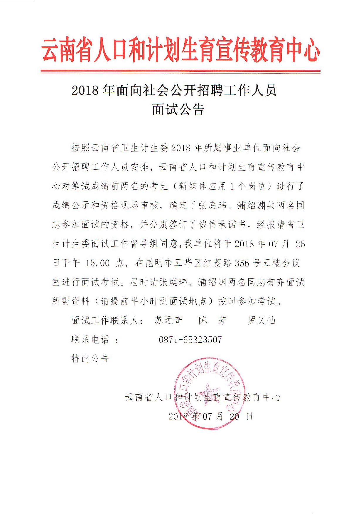 2018年云南省人口和計劃生育宣傳教育中心招聘面試公告