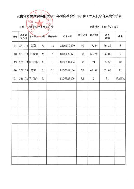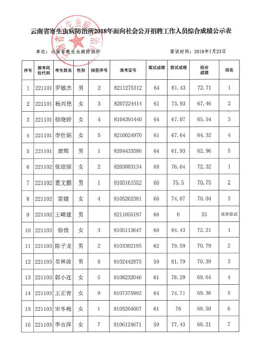 云南省寄生蟲病防治所2018年招聘人員綜合成績公示表