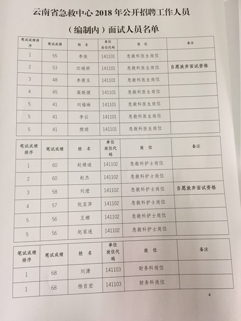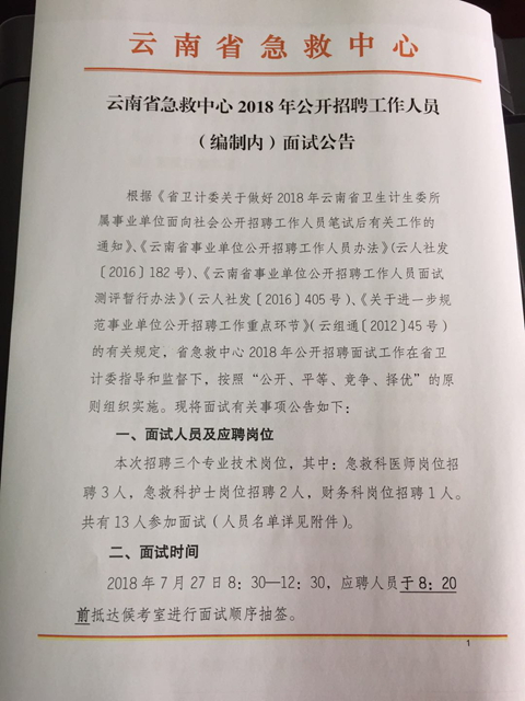 云南省急救中心2018年公開招聘工作人員(編制內(nèi))面試公告