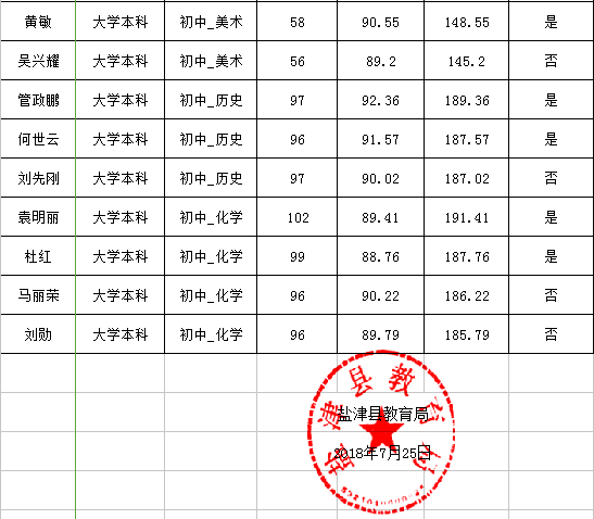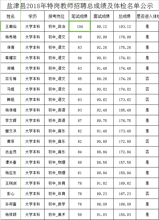 昭通市鹽津縣2018年特崗教師招聘總成績(jī)及體檢名單