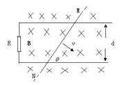 2. 如圖所示,平行導(dǎo)軌間距為d=1m,一端跨接一個(gè)電阻R=2Ω。勻強(qiáng)磁場(chǎng)B=0.5T,方向垂直于平行金屬導(dǎo)軌所在平面。一根金屬棒與導(dǎo)軌成Θ=60。角放置,金屬棒與導(dǎo)軌的電阻均不計(jì)。當(dāng)金屬棒沿垂直于棒的方向以恒定速度v=4m/s在金屬導(dǎo)軌上滑行時(shí),通過(guò)電阻R的電流是多少?