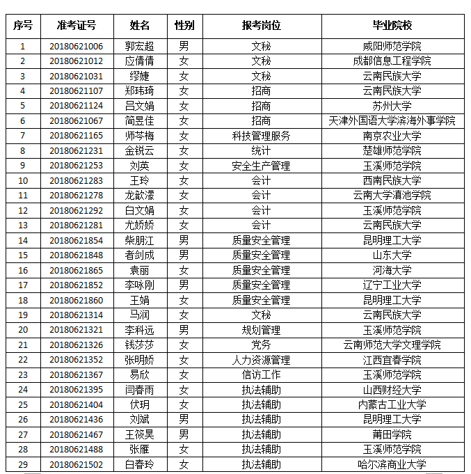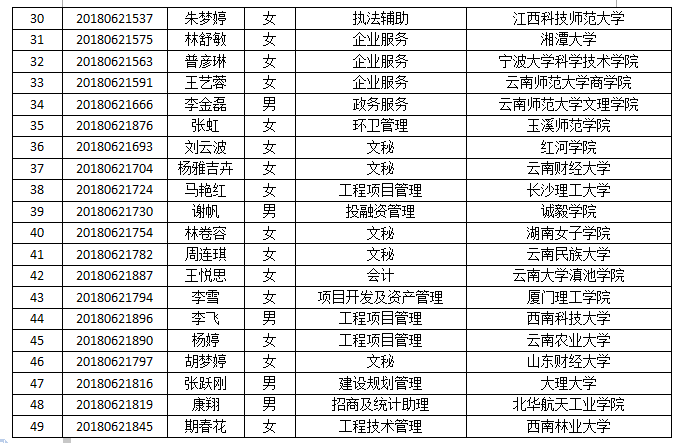 根據(jù)《玉溪高新區(qū)融建集團(tuán)投資有限公司2018年公開招聘工作人員公告》有關(guān)規(guī)定,經(jīng)報(bào)名、資格審查、考試、體檢、政審合格,確定擬聘用人員,現(xiàn)公示如下: