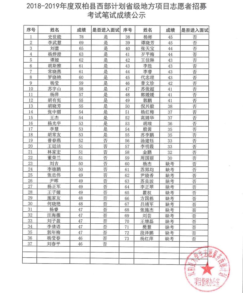經(jīng)過州項目辦統(tǒng)一閱卷,按照州項目辦分配我縣新招募名額9名和參加面試人數(shù)與當前新招募志愿者人數(shù)比例不低于2:1的規(guī)定,我縣2018-2019年度大學(xué)生志愿服務(wù)西部計劃省級地方項目志愿者按照筆試成績?nèi)∏?8名進入面試,面試方式為結(jié)構(gòu)化面試?,F(xiàn)將筆試成績及進入面試人員名單公示如下,有效公示期為3天(7月27日00:00—7月29日24:00)。