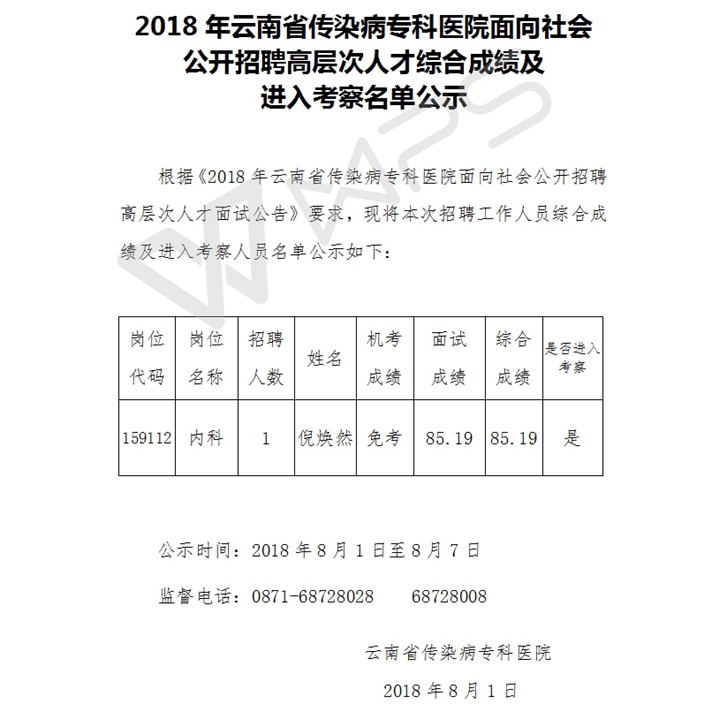 2018年云南省傳染病專科醫(yī)院招聘高層次人才綜合成績及進(jìn)入考察名單公示