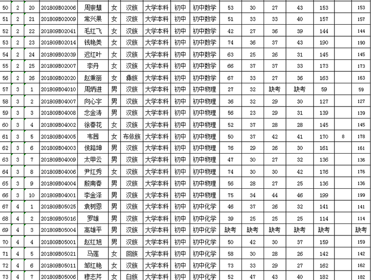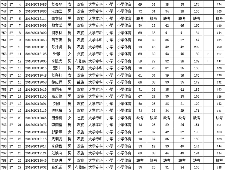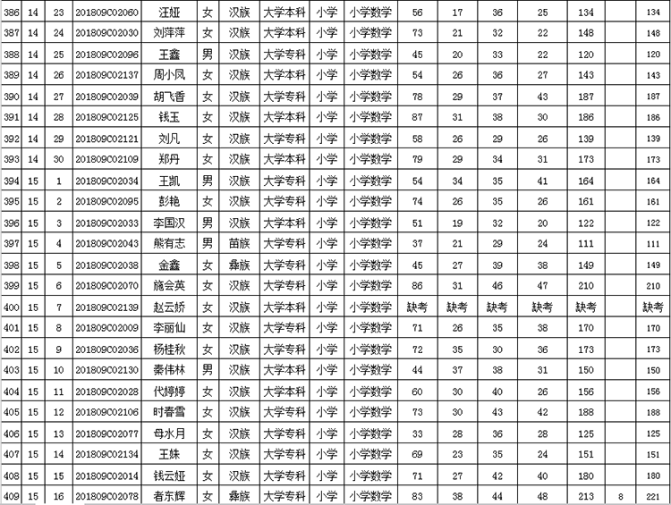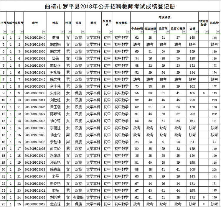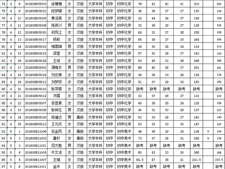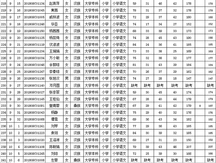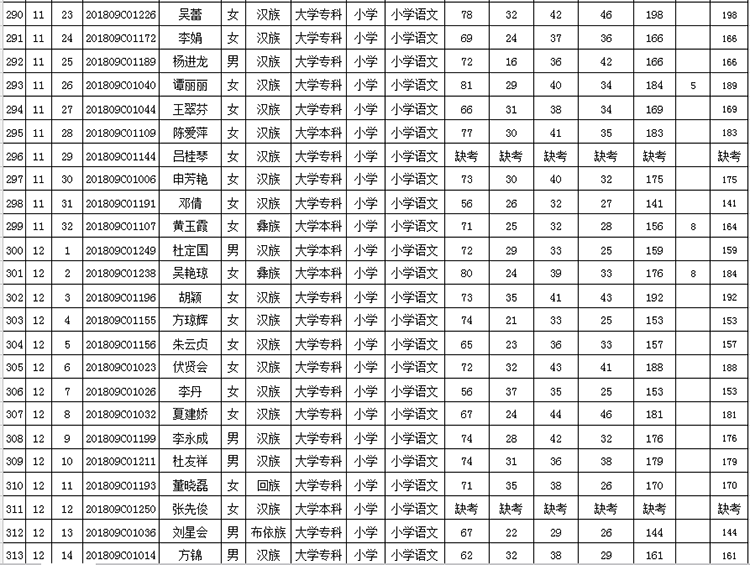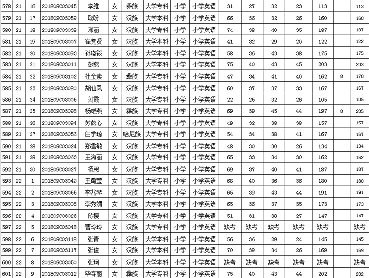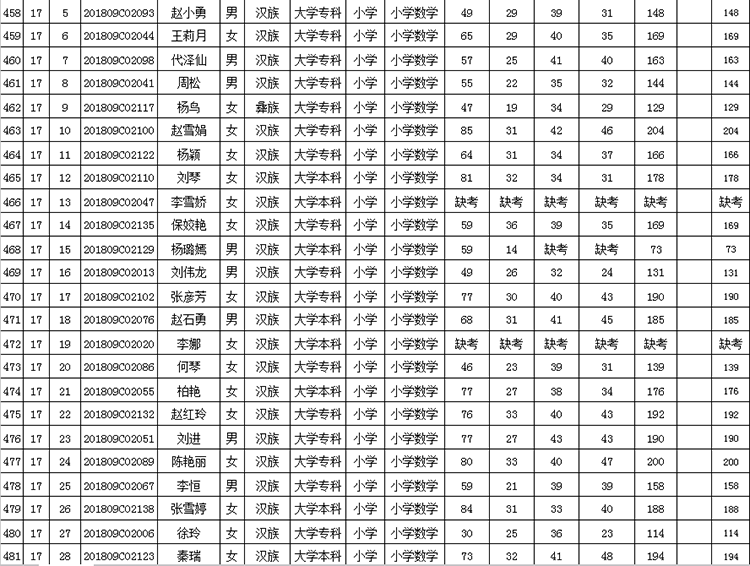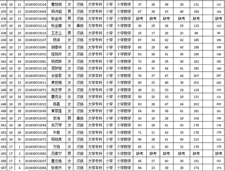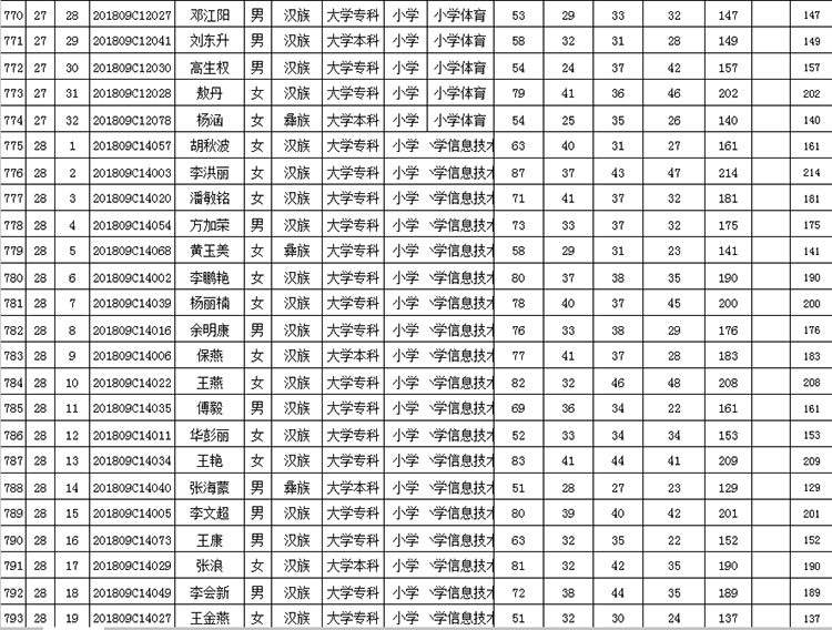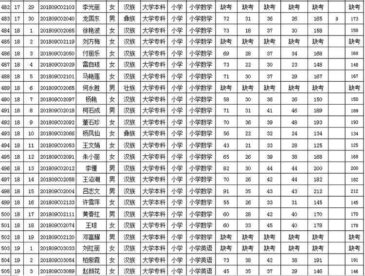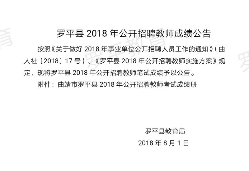 曲靖市羅平縣2018年公開招聘教師成績公告
