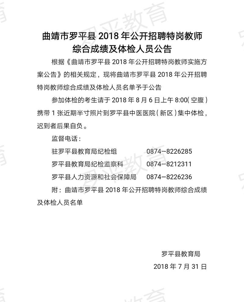 2018年曲靖市羅平縣招聘特崗教師綜合成績及體檢人員公告