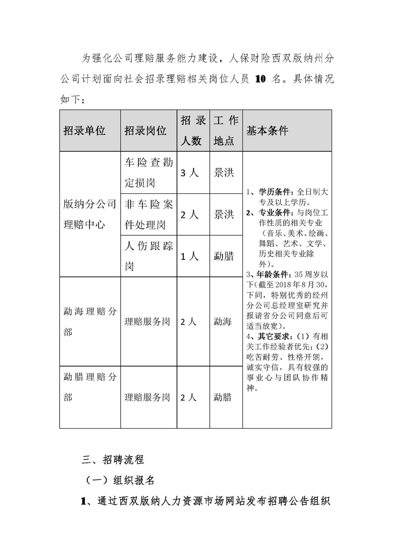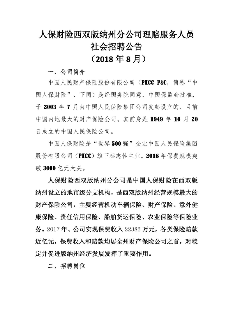 2018年人保財險西雙版納州分公司理賠服務人員社會招聘公告