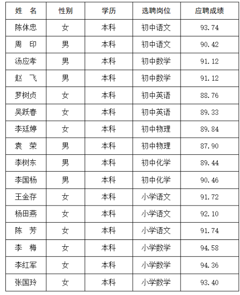 為滿足2018年學(xué)校教育教學(xué)工作的需要,優(yōu)化教師隊伍結(jié)構(gòu),提高教師隊伍素質(zhì)。根據(jù)《中共臨滄市委臨滄市人民政府關(guān)于進一步深化學(xué)校人事制度改革的意見》(臨發(fā)〔2011〕83號)精神,按照經(jīng)教育主管部門及人力資源和社會保障審定同意的《臨滄市第一中學(xué)天有實驗學(xué)校2018年公開選聘教師工作實施方案》,在教育主管部門、市紀委市監(jiān)察委駐市教育局紀檢組和市人社局的監(jiān)督指導(dǎo)下,嚴格按程序進行了方案公告、報名、資格審查、筆試、資格復(fù)審、面試、體檢等環(huán)節(jié),經(jīng)學(xué)校選聘工作領(lǐng)導(dǎo)組嚴格考察審核,陳體忠等16名同志符合學(xué)校選聘條件和要求,擬選聘到我校任教,現(xiàn)予以公示,公示期為7天(2017年8月8日至8月14日)。