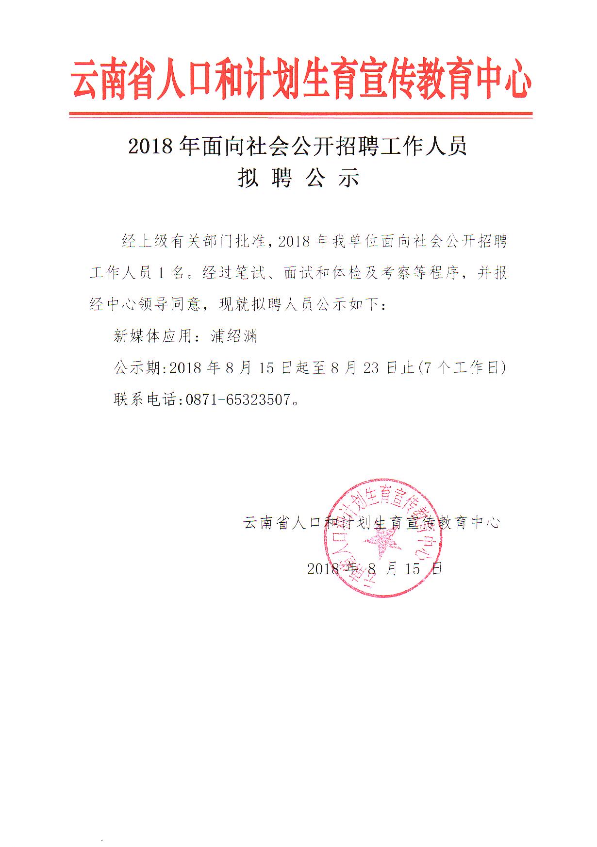 云南省人口和計(jì)劃生育宣傳教育中心2018年招聘擬聘公示
