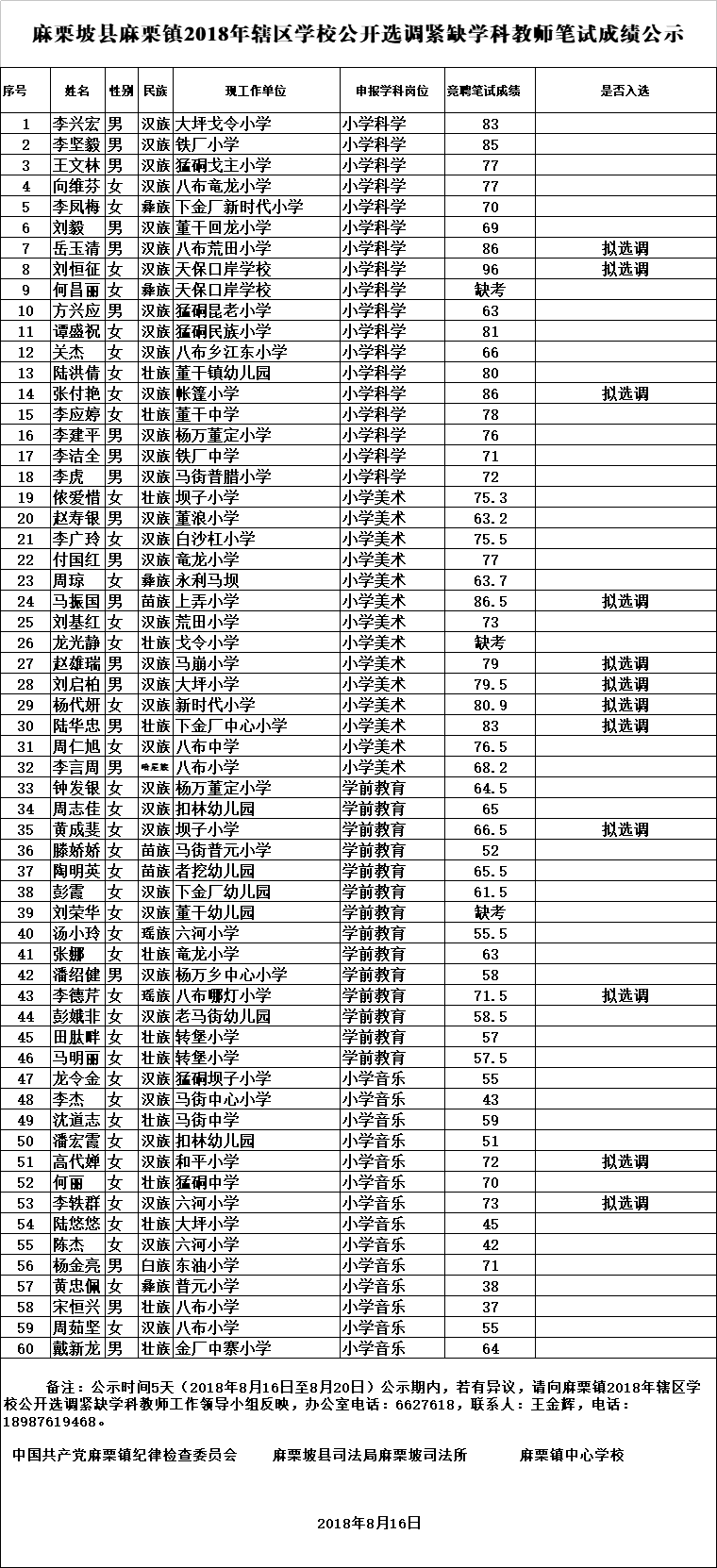 麻栗坡縣麻栗鎮(zhèn)2018年選調(diào)緊缺學(xué)科教師筆試成績(jī)公示