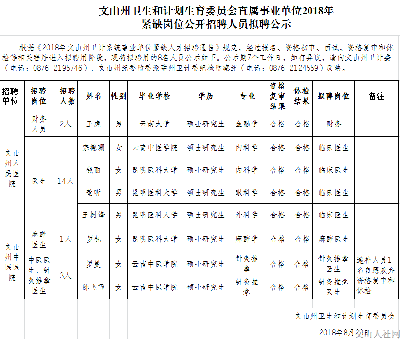 文山州衛(wèi)計(jì)委直屬事業(yè)單位2018年緊缺崗位公開招聘人員擬聘公示