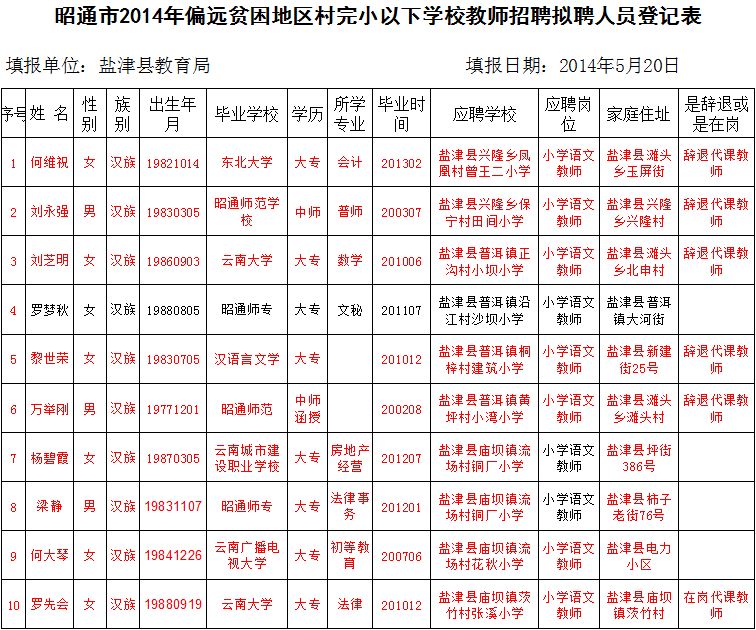 2014年昭通市鹽津縣偏遠(yuǎn)地區(qū)教師擬聘人員公示