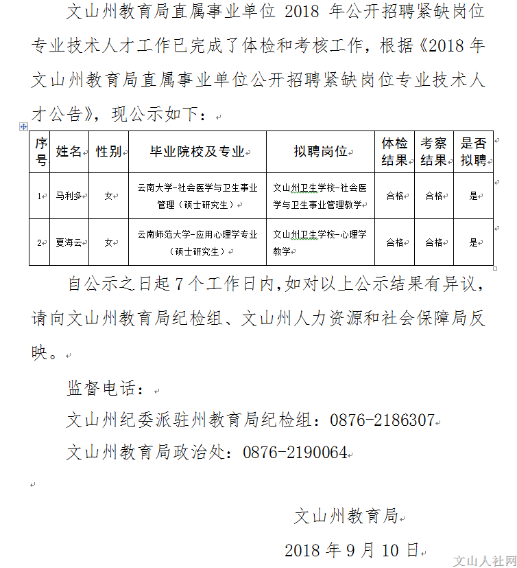 文山州教育局2018年直屬事業(yè)單位公開招聘 緊缺崗位專業(yè)技術(shù)人才擬聘人員公示