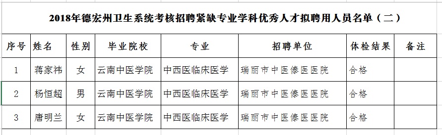 [附件:德宏州2018年衛(wèi)生系統(tǒng)考核招聘緊缺專業(yè)學科優(yōu)秀人才擬聘用人員名單(二)]