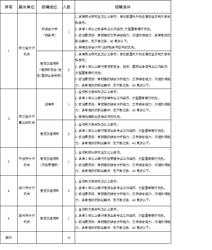 招聘單位包括省級分行機關(guān)、部分二級分行機關(guān),招聘崗位共有10個,具體如下。