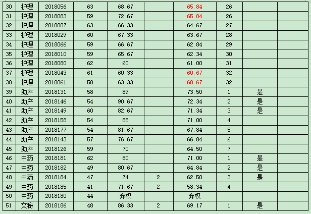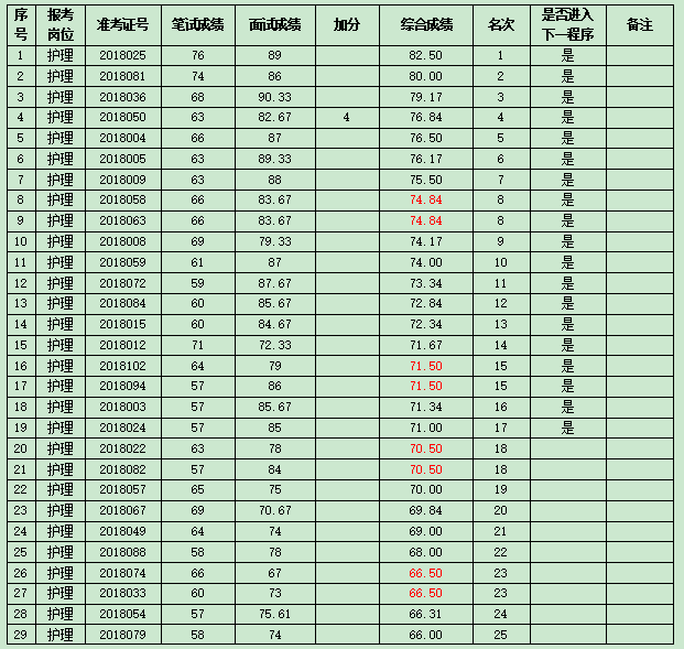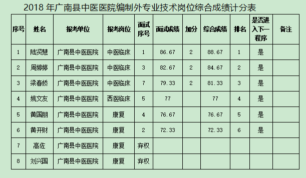 根據(jù)《廣南縣中醫(yī)醫(yī)院2018年招聘編外專業(yè)技術(shù)崗位公告》經(jīng)過報名、筆試、面試,對綜合成績進行計算(四舍五入保留兩位小數(shù)),綜合成績=筆試成績×50%+面試成績×50%+加分(初級師加4分、中級加6分、本科學歷加2分)?,F(xiàn)將綜合成績公示如下: