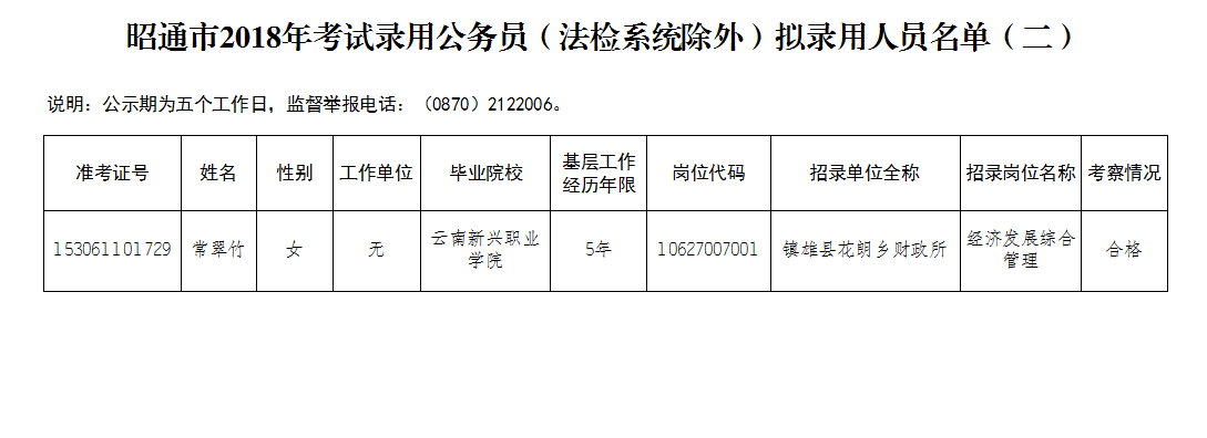 昭通市2018年考試錄用公務(wù)員(法檢系統(tǒng)除外)擬錄用人員名單(二)