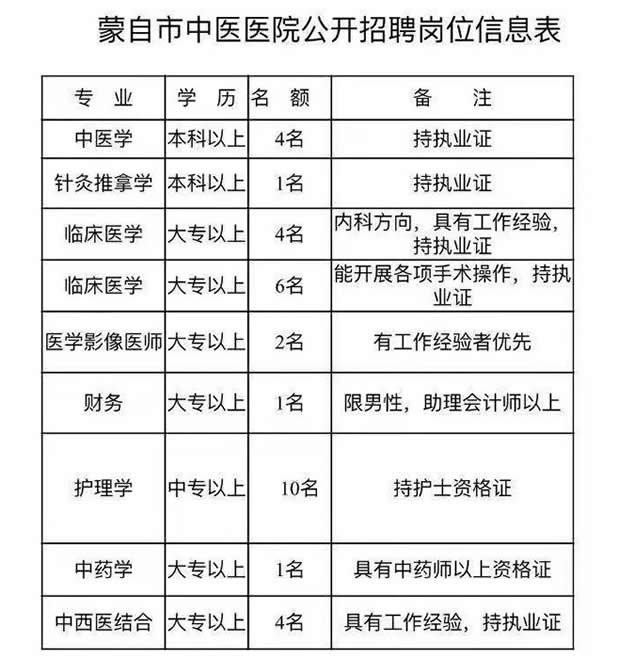 蒙自市中醫(yī)醫(yī)院2018年招聘信息