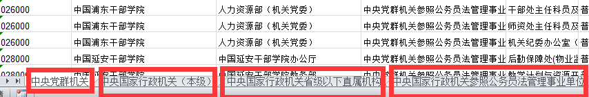 點擊下載后為“.zip”的壓縮文件,請確保你的電腦已經(jīng)安裝解壓縮軟件,否則無法解壓,解壓文件后得到“2019年簡章.xls”的MS-office表格文件,請確保你的電腦已經(jīng)安裝“MS-office辦公軟件”,否則打開的將是亂碼,打開表格文件后可查閱到“中央黨群機關(guān)”“中央國家行政機關(guān)(本級)”“中央國家行政機關(guān)省級以下直屬機構(gòu)”“中央國家行政機關(guān)參照公務(wù)員法管理事業(yè)單位”四張表格,請注意表格左下角不同表格之間的切換,如下圖所示: