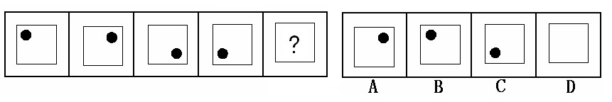 (答案:B。黑點(diǎn)在正方形中順時(shí)針移動(dòng)。在第5個(gè)圖形中,應(yīng)該正好移動(dòng)到左上角。)