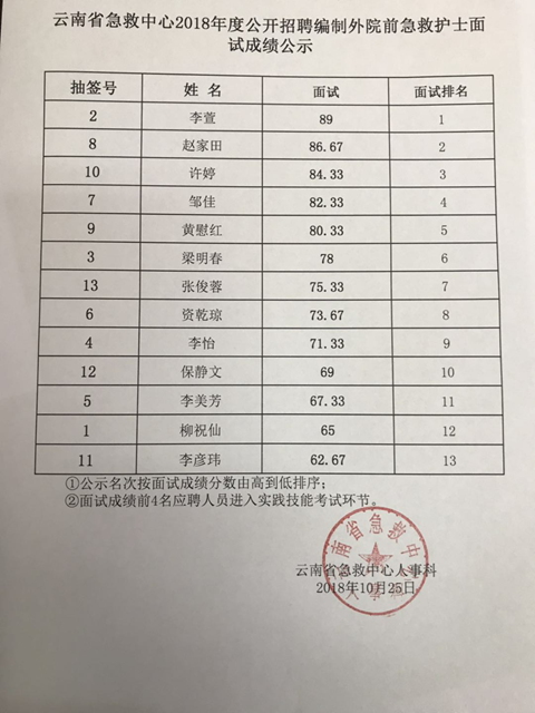 云南省急救中心2018年度公開 招聘編制外院前急救護士面試成績公示
