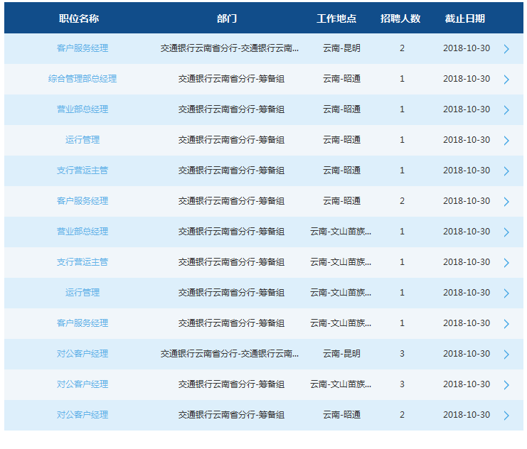 有意應(yīng)聘者,請(qǐng)登錄交通銀行官方網(wǎng)站,由首頁(yè)進(jìn)入“關(guān)于我們”-“人才招聘”-“社會(huì)招聘”-“境內(nèi)行”-“云南省分行”查看招聘職位應(yīng)聘條件、詳細(xì)信息并進(jìn)行網(wǎng)絡(luò)申請(qǐng),申請(qǐng)截止日期為2018年10月30日。