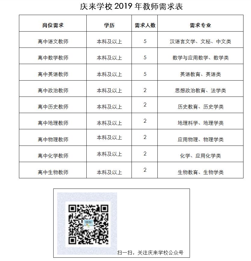五、附件《慶來學(xué)校2019年教師需求表》