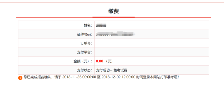 二、減免申請審核通過后,報名系統(tǒng)“支付狀態(tài)”欄會顯示“支付成功—免考試費”提示(如圖示),已經(jīng)繳納報名費的考生將由收費平臺在確認工作結(jié)束后進行退費,還未繳費的考生可不再繳費。如果未顯示圖示界面的考生,建議先支付報名費,防止影響考試。