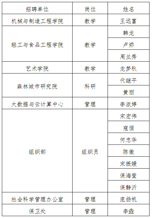 自2018年8月以來(lái),西南林業(yè)大學(xué)啟動(dòng)了2018年第二批特崗教職工招聘工作,經(jīng)發(fā)布公告、報(bào)名、資格審核、筆試、面試等環(huán)節(jié),目前已完成了招聘工作,經(jīng)學(xué)校研究同意,現(xiàn)將擬聘用人員進(jìn)行公示: