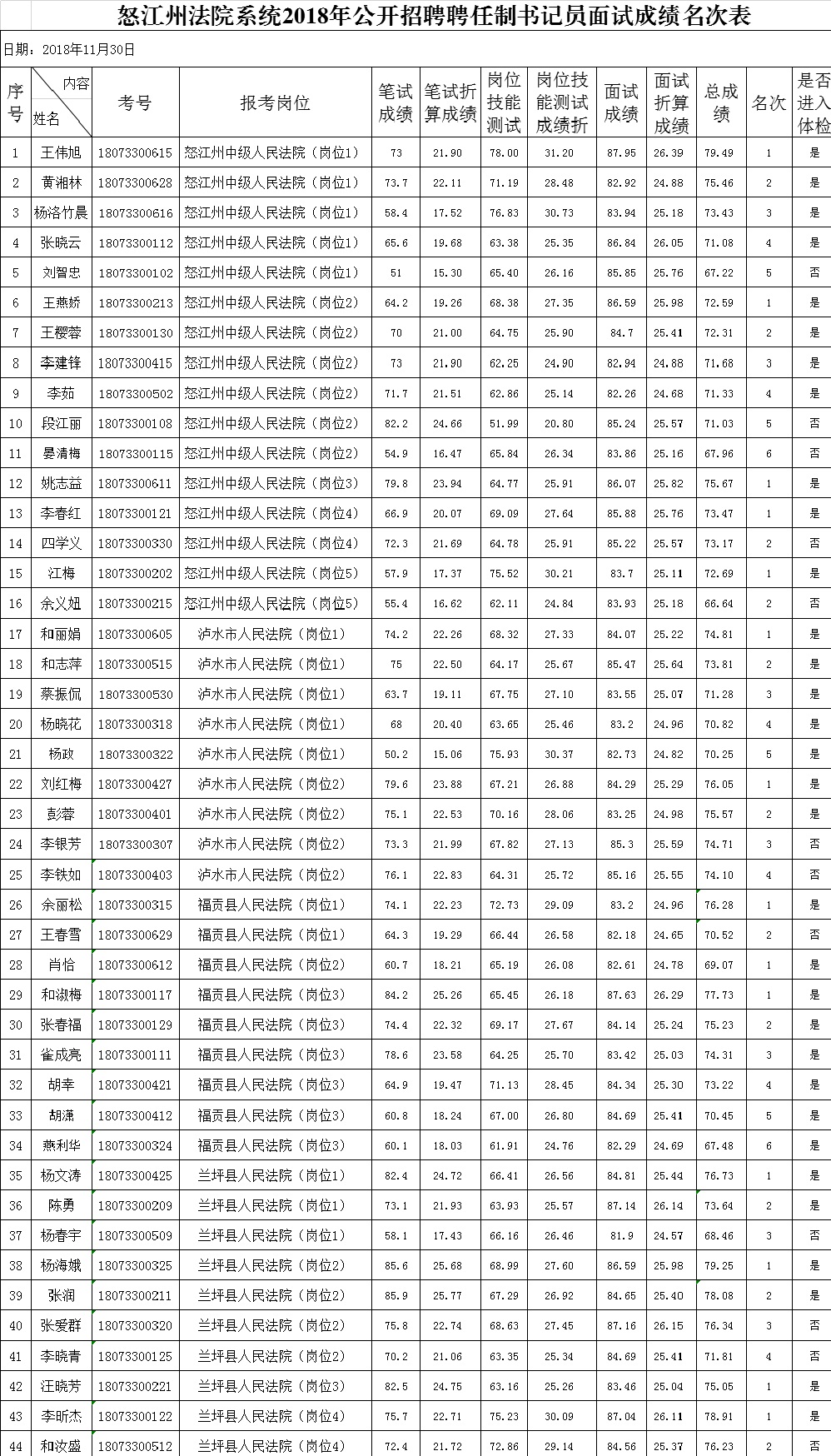 怒江州法院系統(tǒng)2018年公開(kāi)招聘聘任制書記員面試成績(jī)公告 根據(jù)《云南省法院系統(tǒng)2018年公開(kāi)招聘聘用制書記員公告》及其他相關(guān)規(guī)定,怒江州法院系統(tǒng)2018年公開(kāi)招聘聘任制書記員面試工作已經(jīng)全面結(jié)束,現(xiàn)將參加面試人員成績(jī)作如下公告,請(qǐng)進(jìn)入體檢的考生于2018年12月3日上午8:30到怒江州中醫(yī)院一樓集中進(jìn)行體檢。