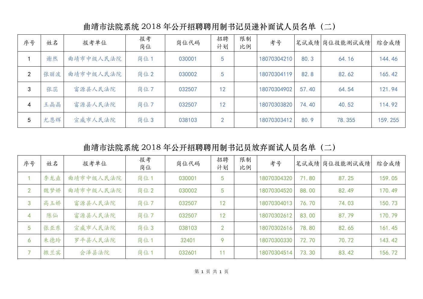 曲靖市法院系統(tǒng)2018年招聘聘用制書記員遞補面試名單