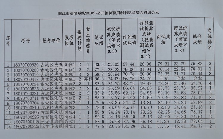 麗江市法院系統(tǒng)2018年公開招聘聘用制書記員綜合成績(jī)公示